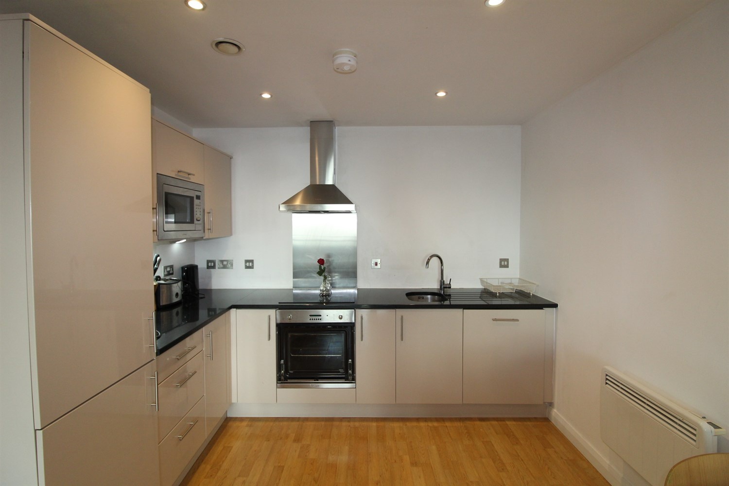 Large open plan living area and kitchen, space for dining table, lounge area with electric heater, sliding doors leading to balcony. Modern kitchen fitted with a range of wall and base units with worktops over, stainless steel sink with mixer tap, electric oven and hob with extractor overhead. Microwave fitted in to overhead space, Intergraded fridge freezer and dishwasher, lights under cupboards.