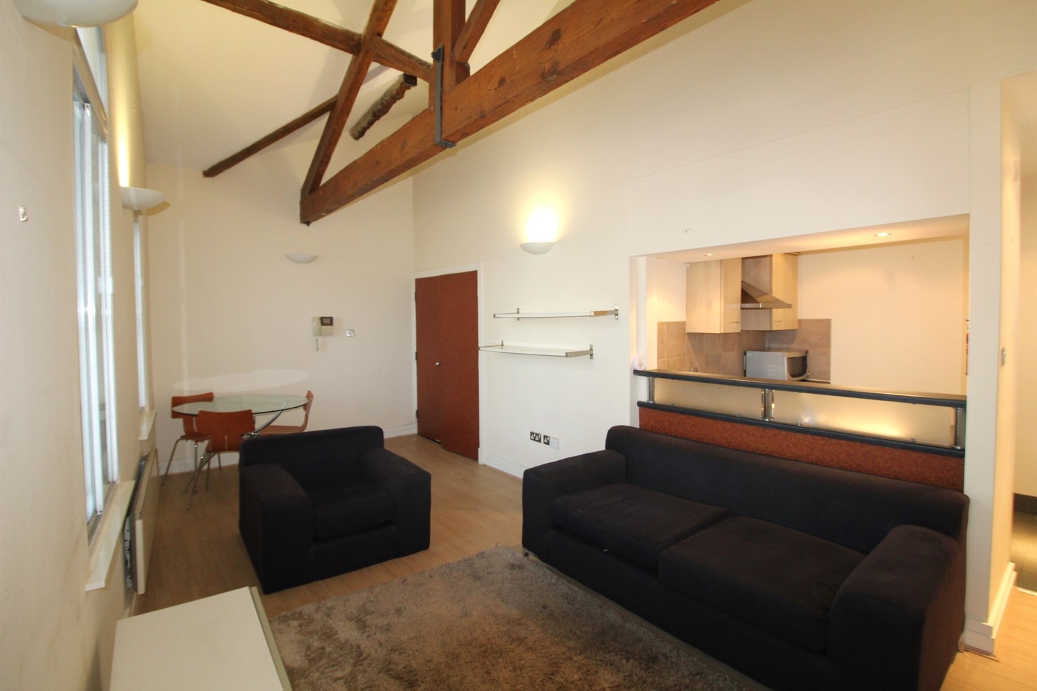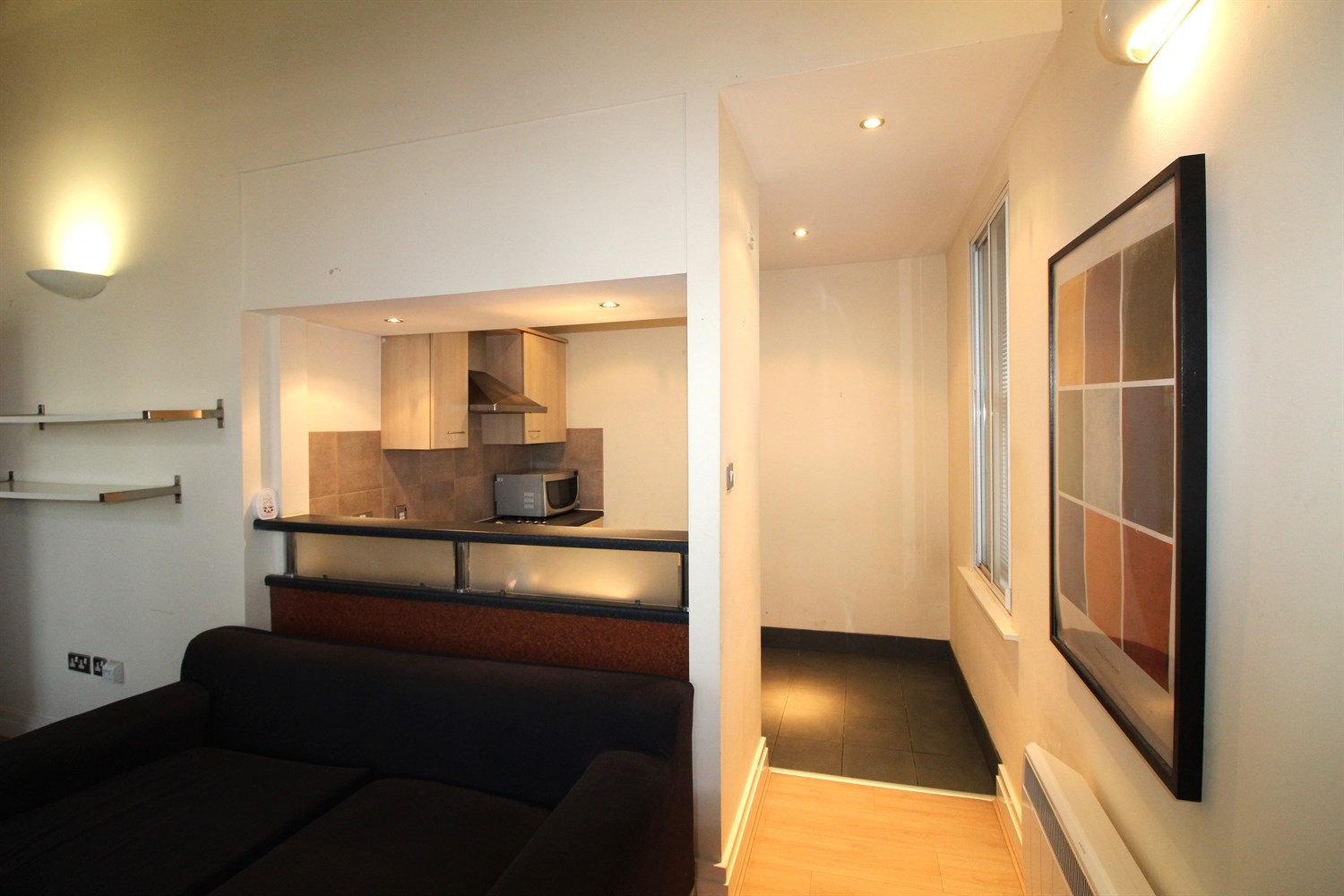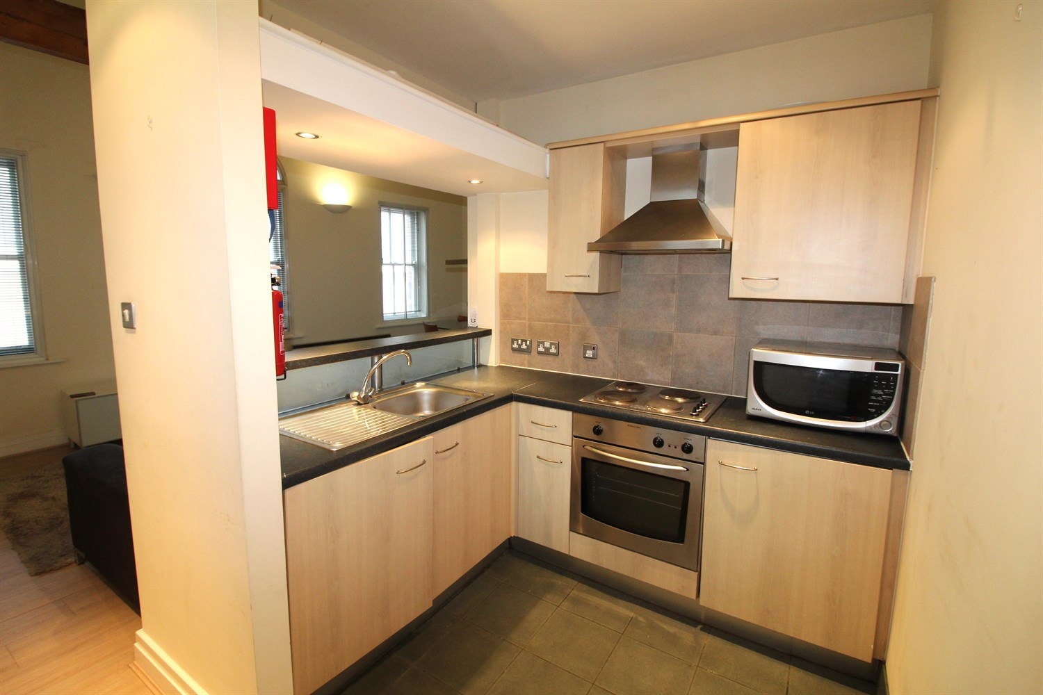 Open plan living room and kitchen with two windows, electric heater, kitchen fitted with a range of wall and base units with work tops over, stainless steel sink with mixer tap and drainer. Electric oven and hob with extractor ab