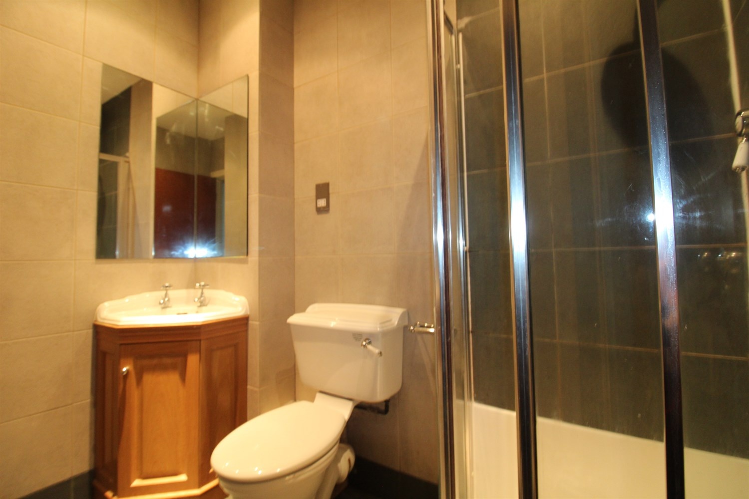 Three piece bathroom with walk in shower, w/c and hand wash basin. Tiled walls.