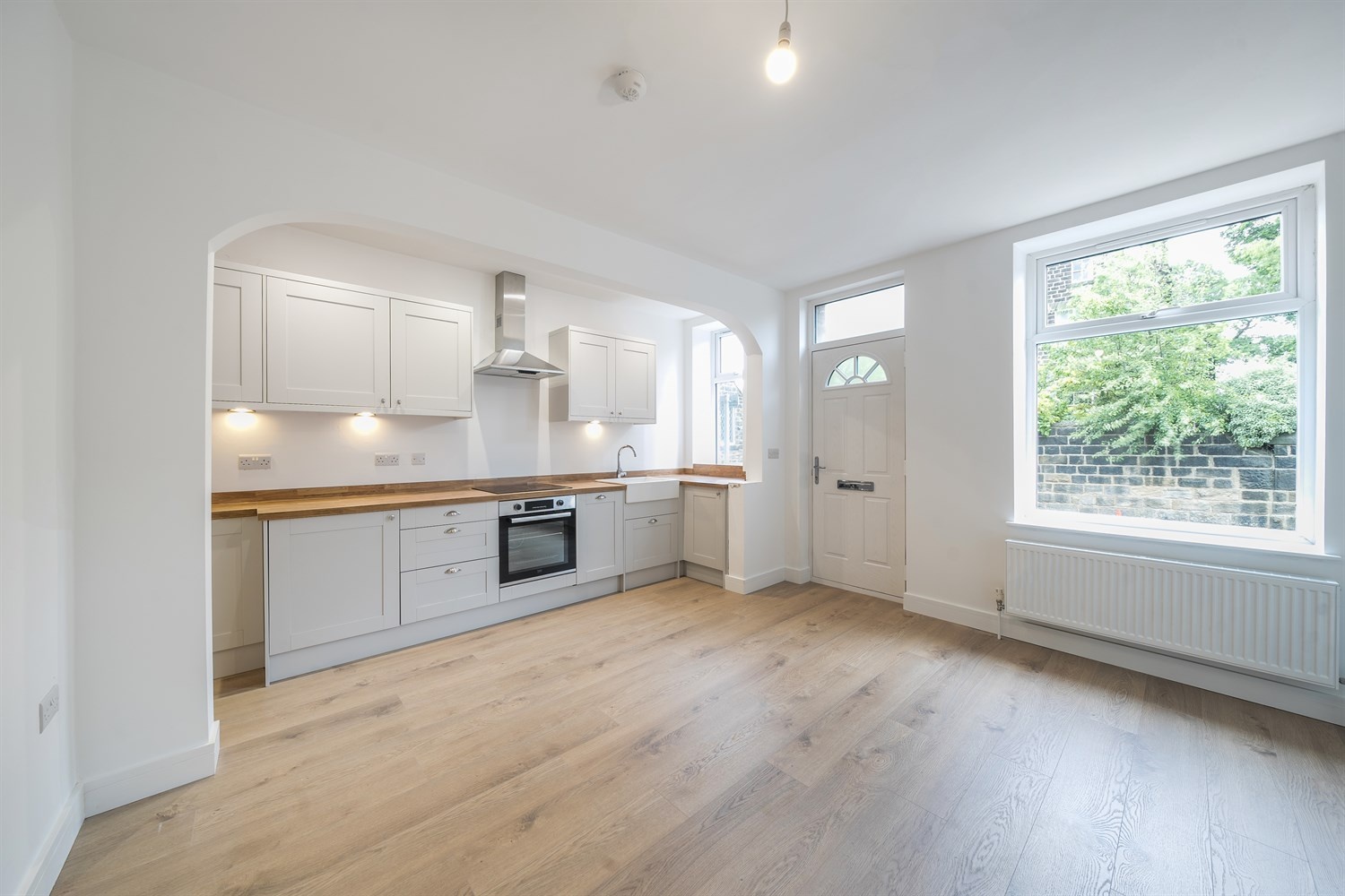 Via front entrance door. Modern open plan living room/kitchen. Fitted with a range of wall, base and drawer units with work surface over. Ceramic sink and with mixer tap. Integrated electric oven and induction hob with stainless steel extractor above. Integrated dishwasher and fridge. Two UPVC double glazed windows to the front. Feature open fireplace ideal for log burning stove. Gas central heating radiator.