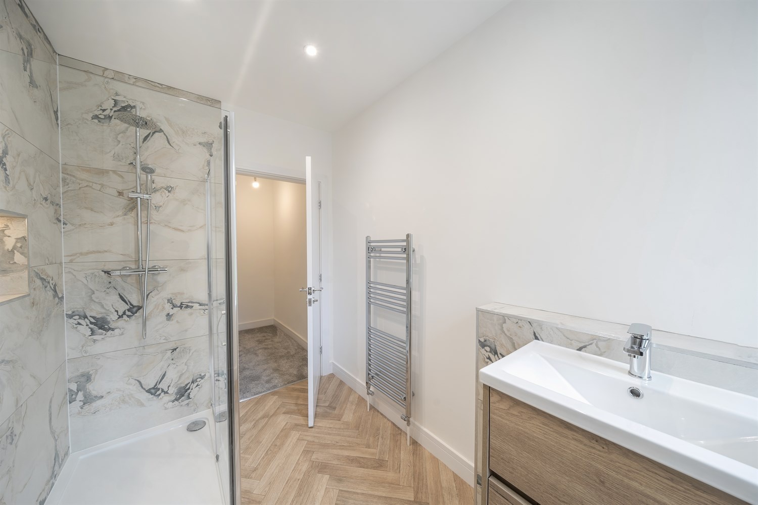 Beautiful fitted shower room comprising; walk in shower cubicle, vanity wash hand basin and WC. Tiled walls. Wall mounted heated towel rail. uPVC double glazed window.