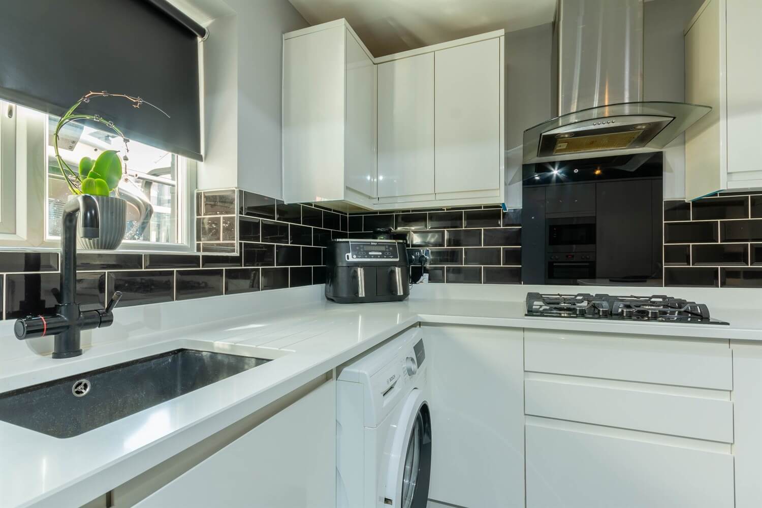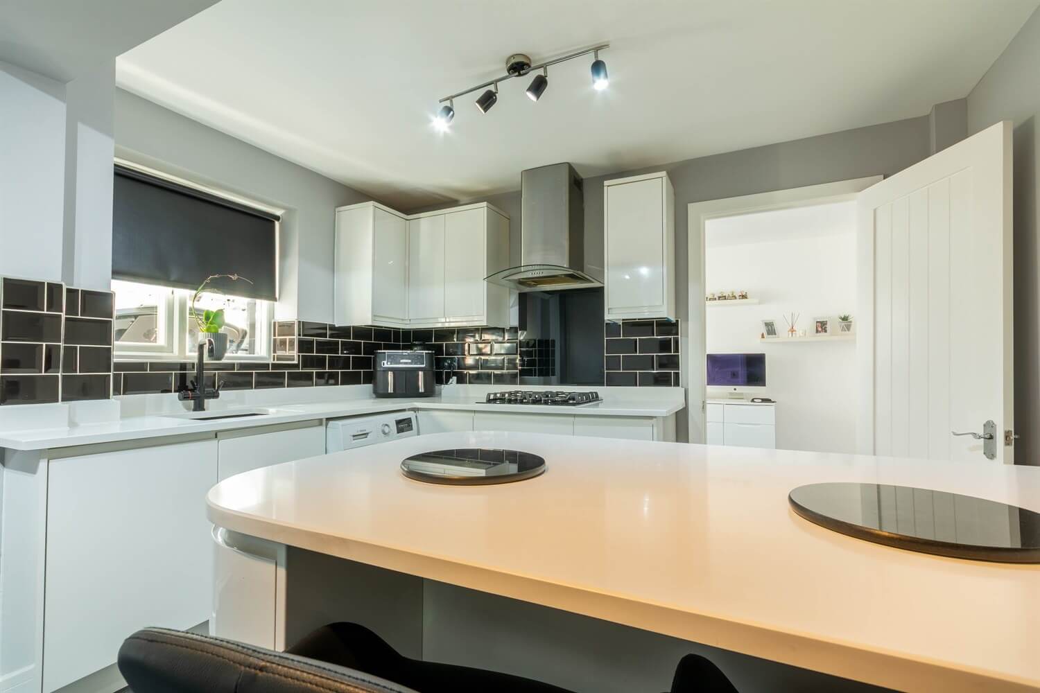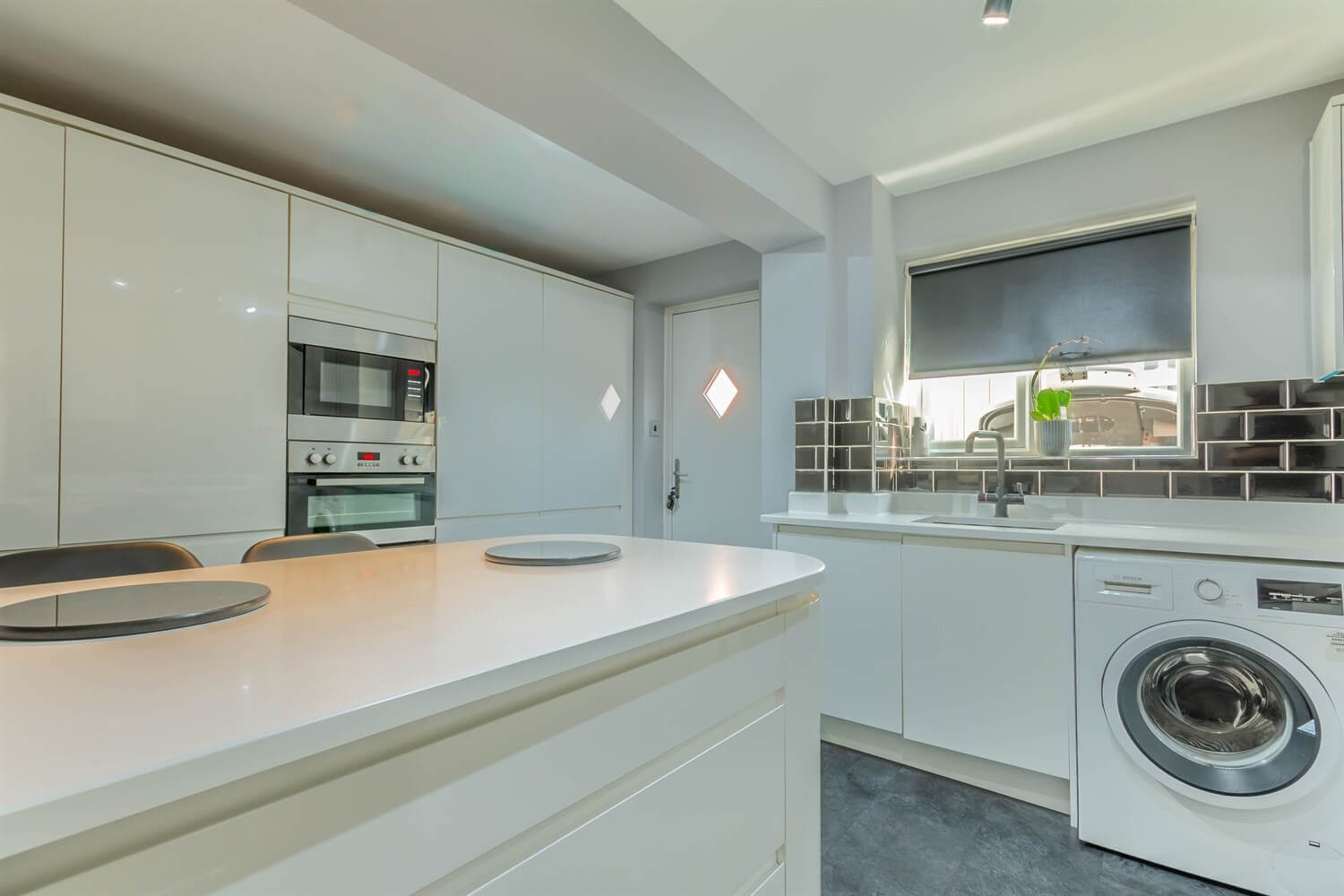 Fitted with a range of wall, base and drawer units with quartz worktops over. Sink with boiling water tap. Integrated double oven and microwave. 4-ring gas hob with extractor hood over. Integrated fridge/freezer. Space for washing machine. Part tiled walls. uPVC double glazed window to rear. Door leading to rear garden and front drive.