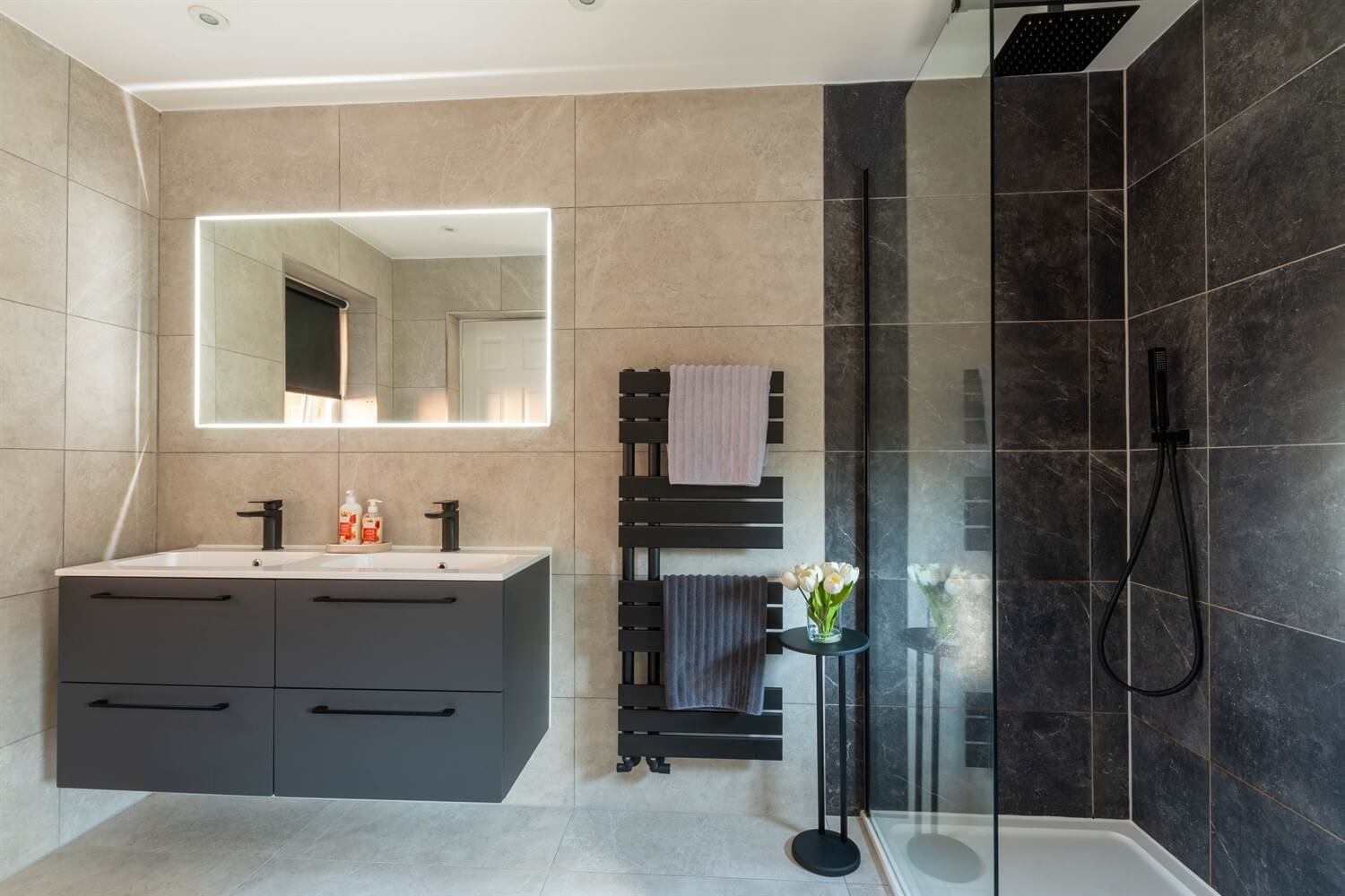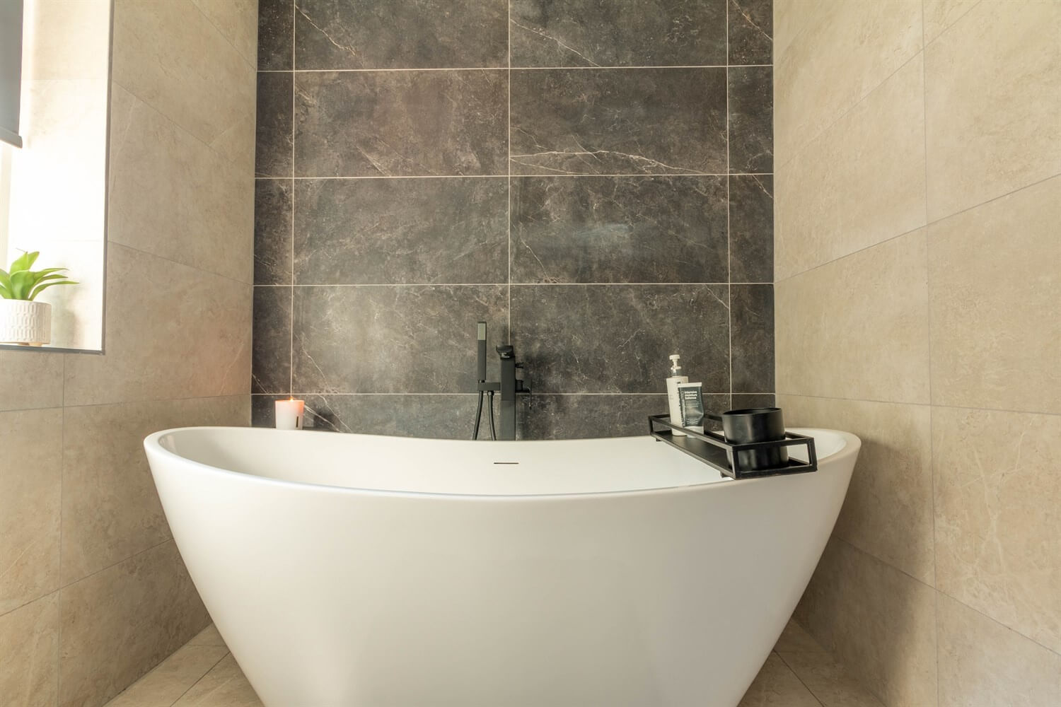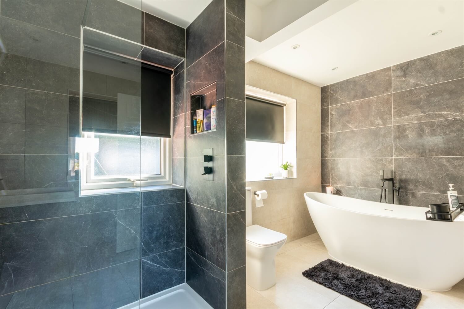 Beautifully presented bathroom. Fitted with a four piece suite comprising; walk in shower cubicle, freestanding bath with freestanding bath shower mixer tap, WC and double vanity wash hand basin. Tiled walls and floor. Two uPVC double glazed windows to the rear and one uPVC double glazed window to front. Inset ceiling spotlights.