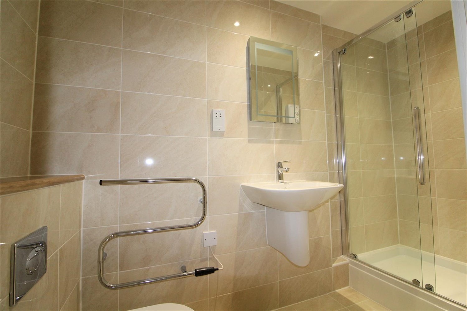 Three piece bathroom suite with walk in shower, w/c and hand wash basin, large mirror. Tiled walls and floor, electric towel heater.