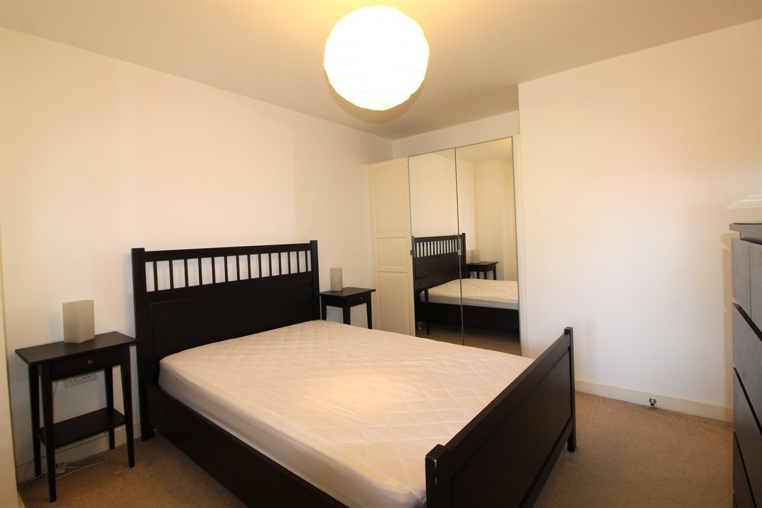 Carpeted double bedroom with wardrobe. Electric wall heater.