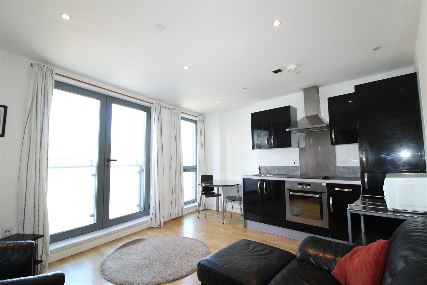 Living area with doors opening to a Juliet balcony, kitchen fitted with range of wall base units with work tops over integrated fridge freezer.