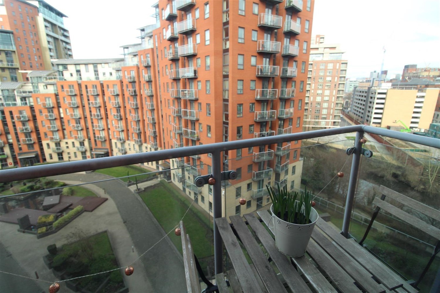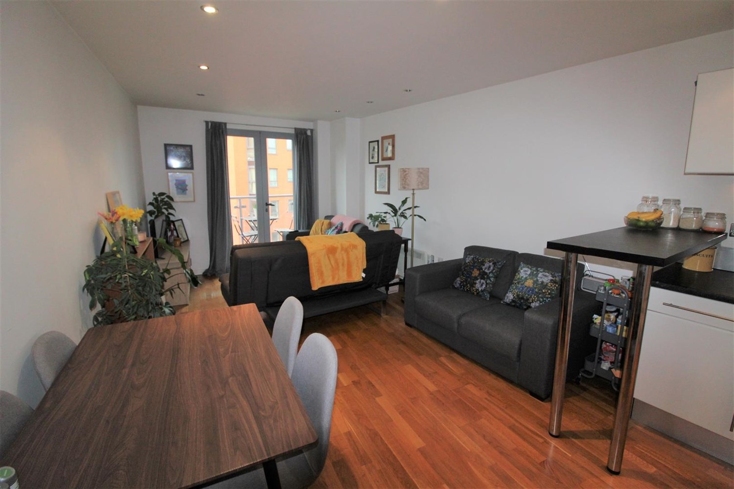 Spacious living area with electric panel radiator. Inset ceiling spotlights. Access to balcony. Fitted with a range of wall, base and drawer units with worktops over. Integrated oven with 4-ring hob and extractor over. Integrated fridge, freezer and dishwasher. Stainless steel bowl sink mixer tap and drainer.