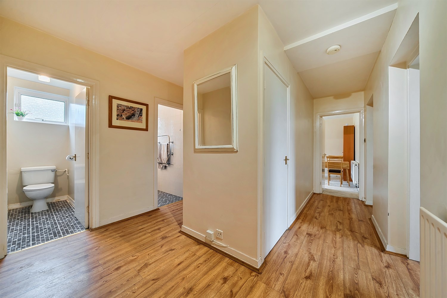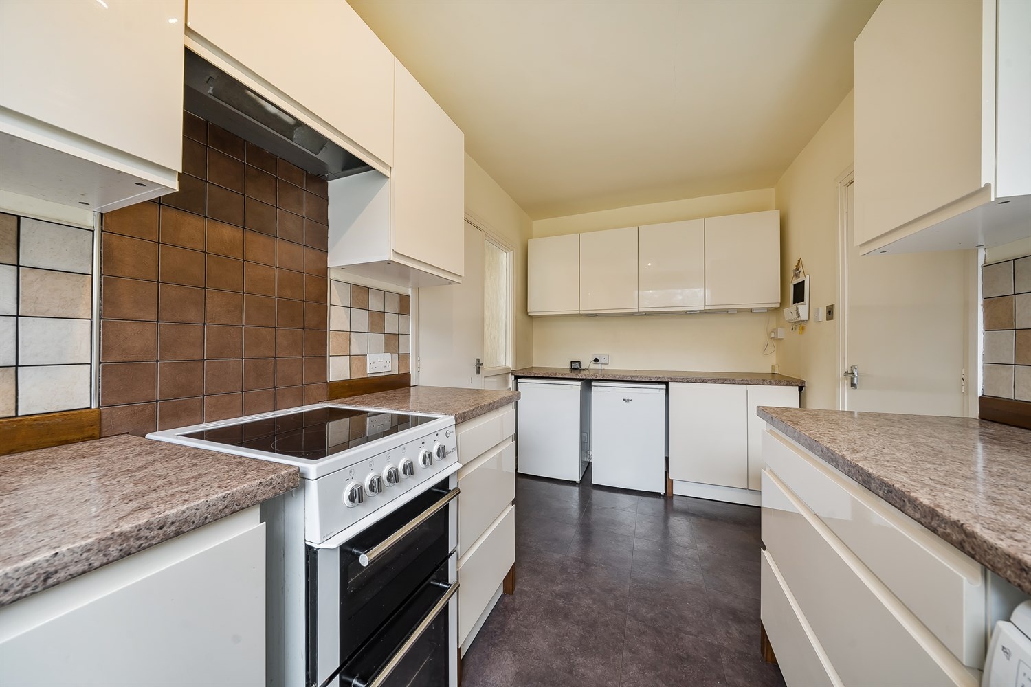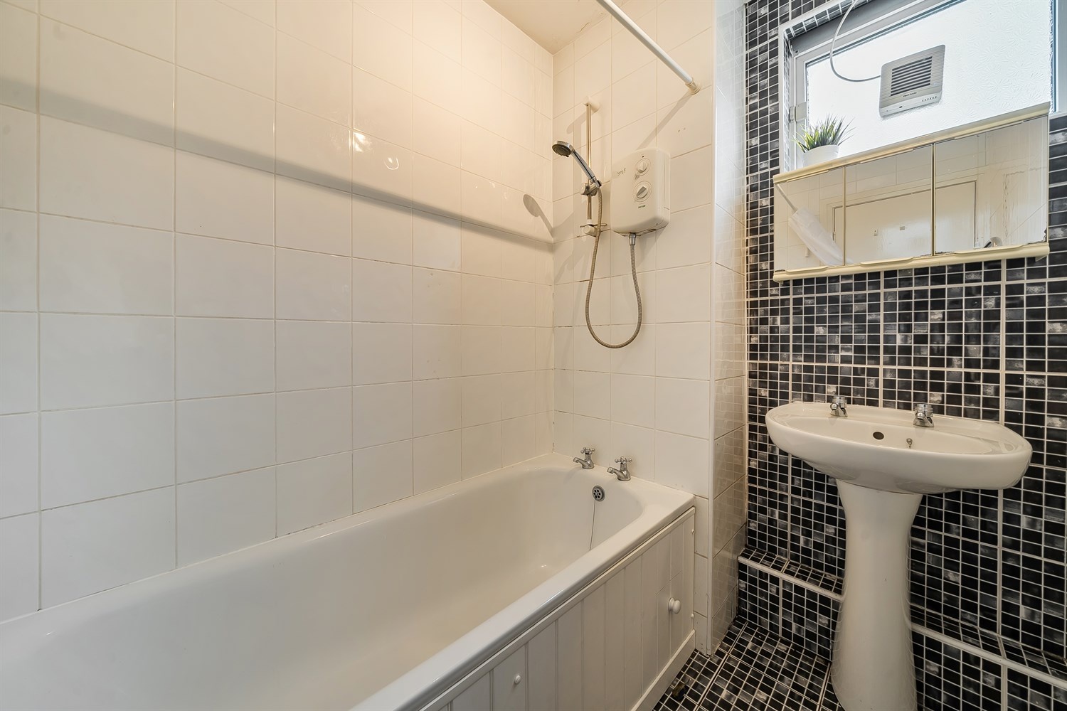Fitted with a range of wall, base and drawer units with worktops over. Stainless steel sink with mixer tap and drainer. Space for dishwasher, washing machine, fridge and cooker. Double glazed window to front. Part tiled walls.