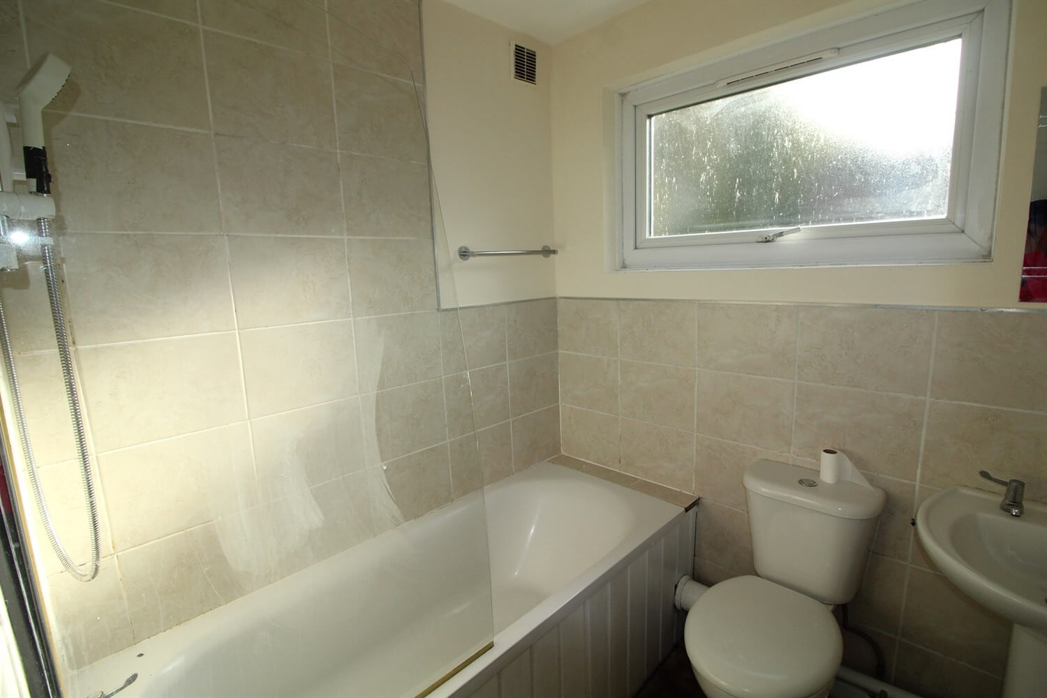 3 piece bathroom suite briefly comprising of a low level flush toilet, sink with pedestal and bath tub with shower over, electric towel rail.