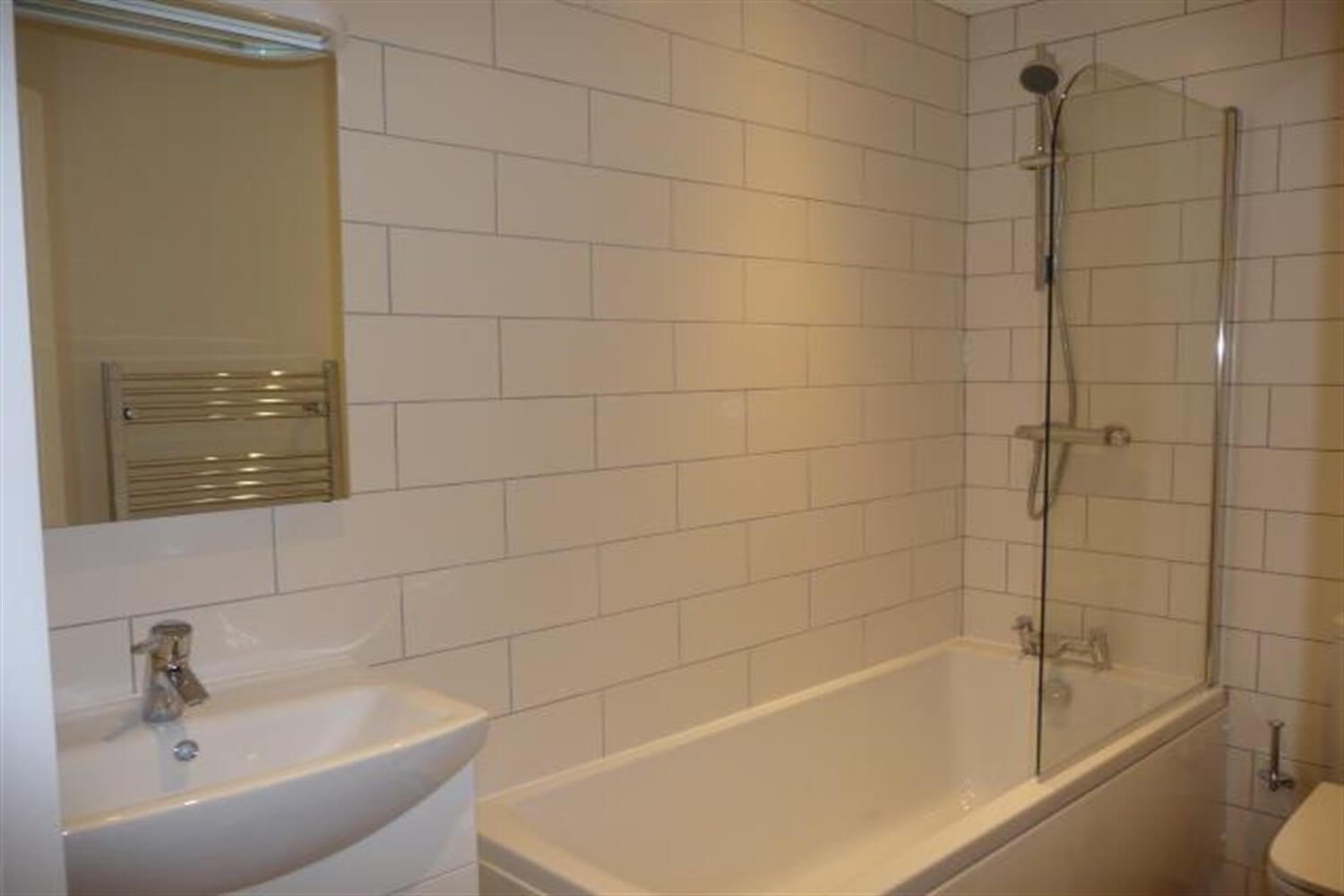 Three piece white bathroom suite with shower over head, glass shower screen, hand wash basin and w/c, tiled walls electric towel radiator.