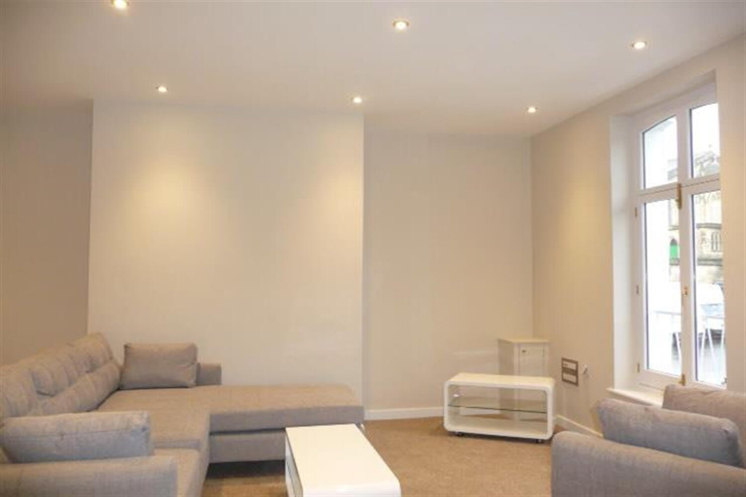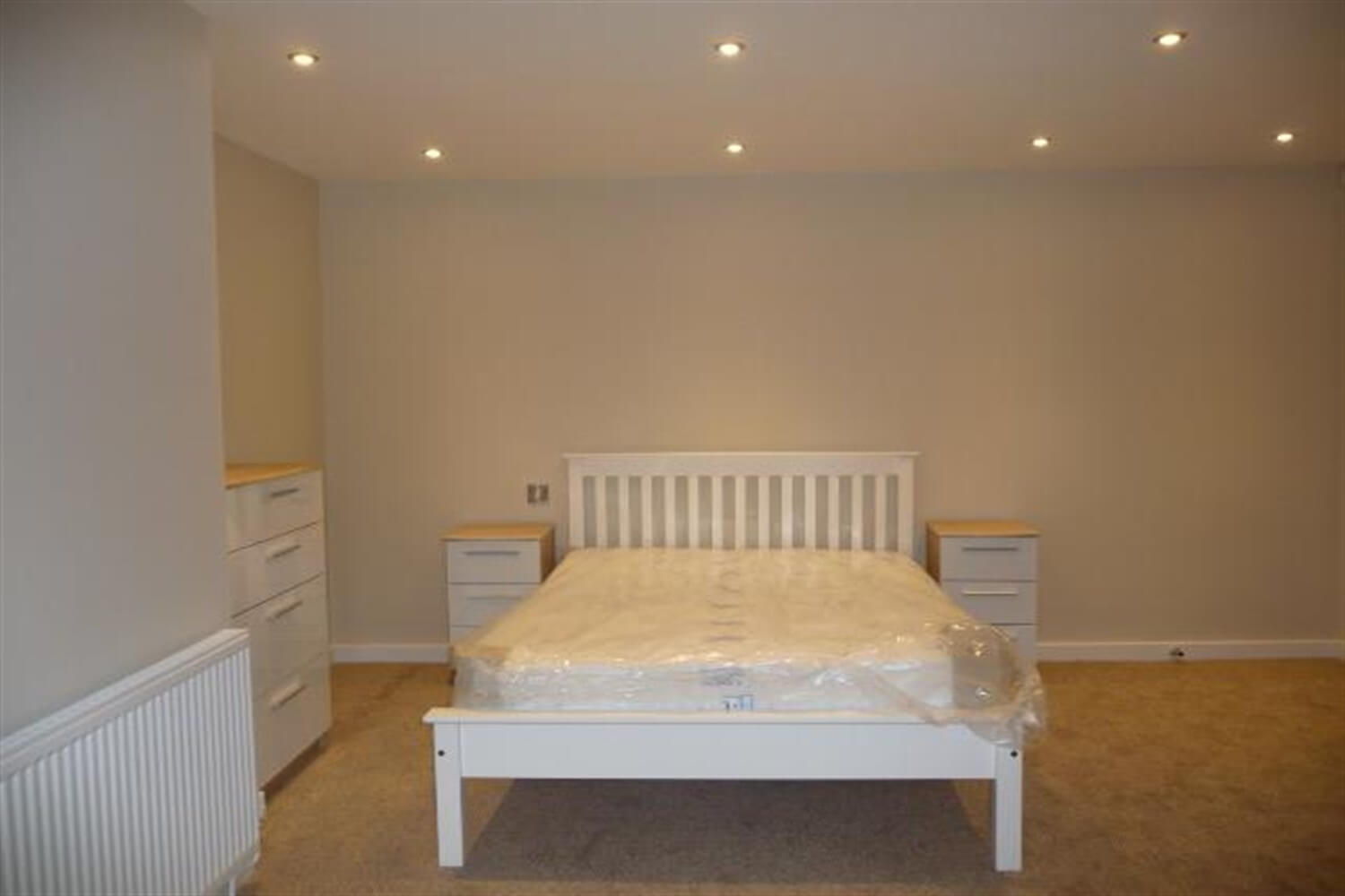 Large double bedroom with inset spot lights electric heater.