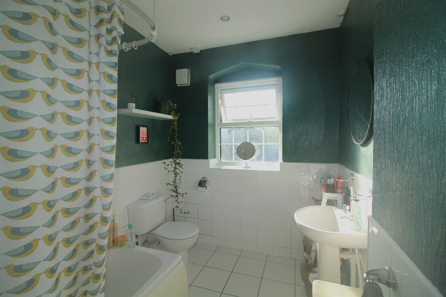 Three piece white bathroom suite with w/c and hand wash basin. Part tiled, gas central heating radiator.