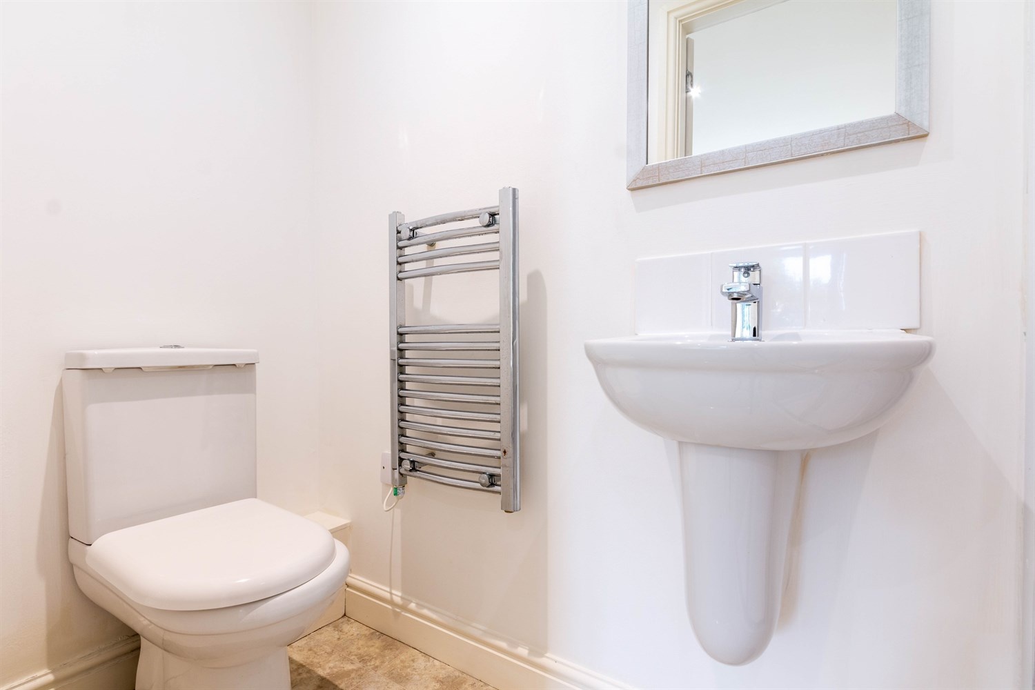 Fitted with a three piece white suite comprising shower cubicle, WC and wash hand basin. Part tiled walls. Chrome heated ladder towel rail.