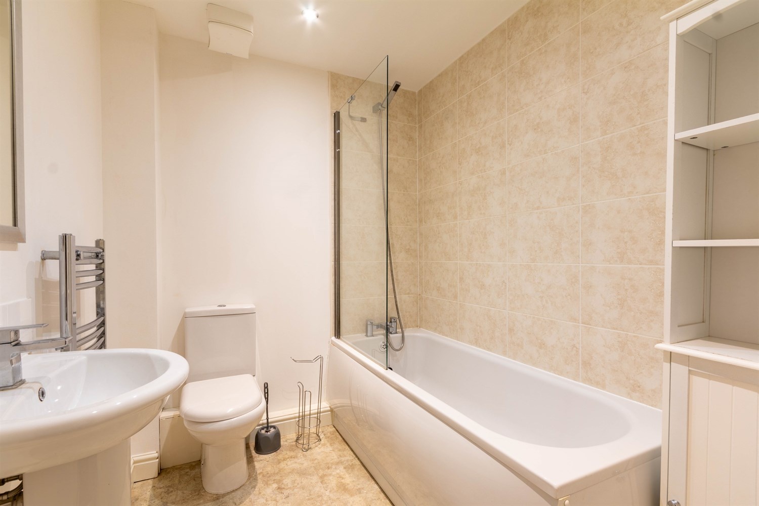 Fitted with a three piece white suite comprising bath with shower attachment to the taps and glass screen, WC and wash hand basin. Part tiled walls. Chrome heated ladder towel rail.