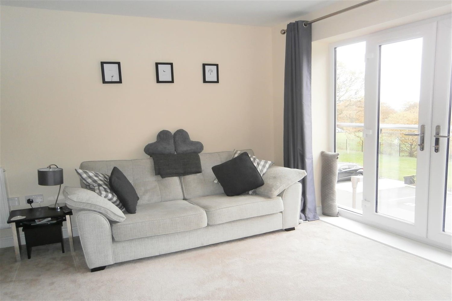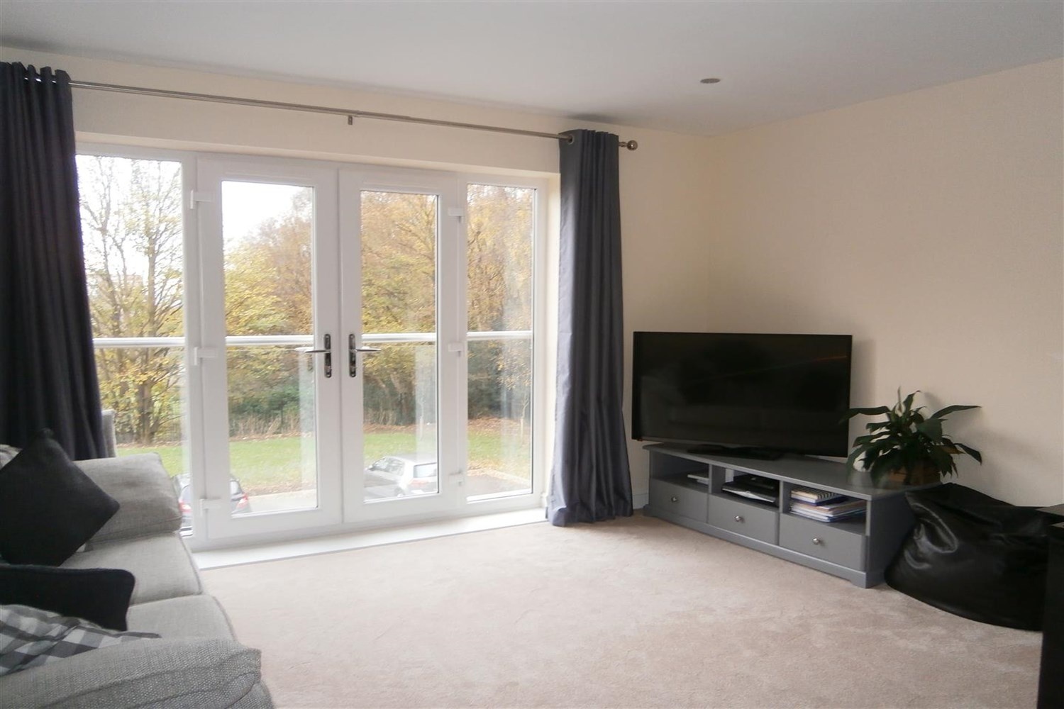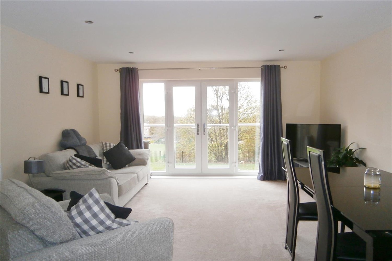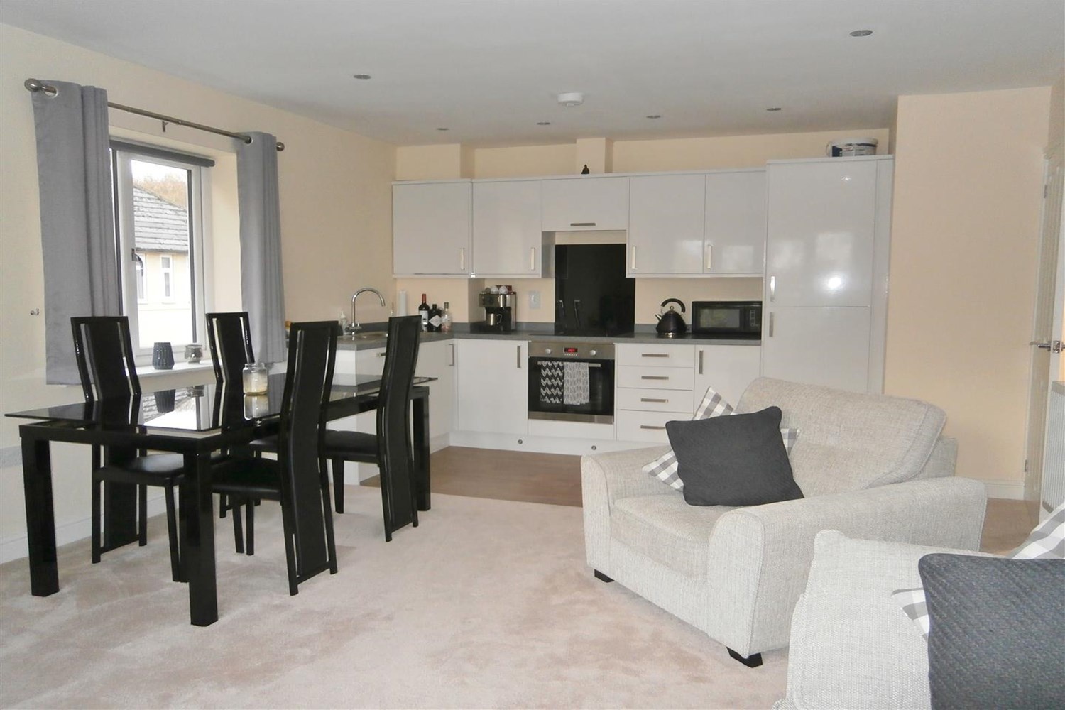 light and airy living area with French doors opening on a Juliet balcony, gas central heating radiator. Modern kitchen fitted with a range of wall and base units with work tops over, integrated appliances, including fridge freezer, and dishwasher.