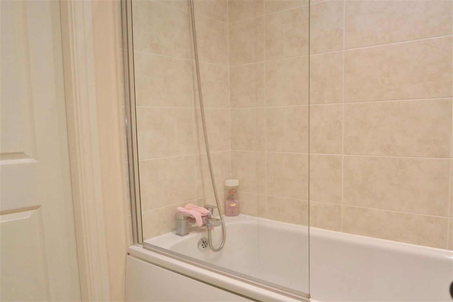 Bathroom compromising of bath with shower over head, shower screen, w/c and hand wash basin, tiled walls, towel radiator.