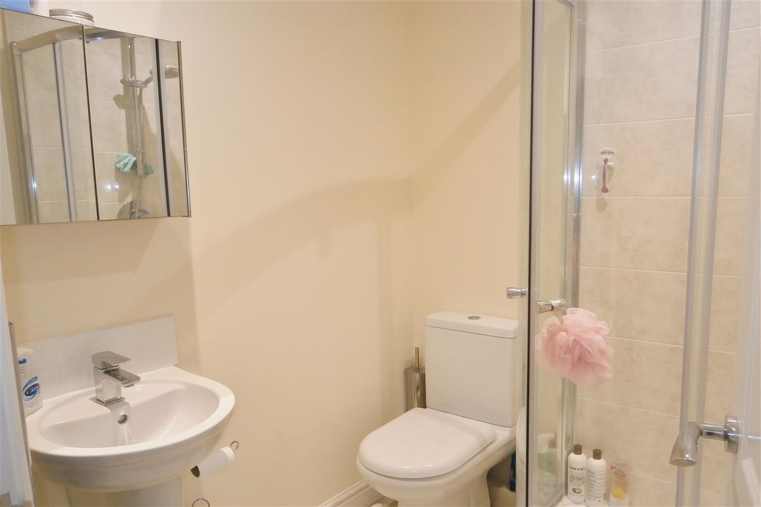Ensuite compromising of walk in shower, w/c and hand wash basin, tiled walls, towel radiator.