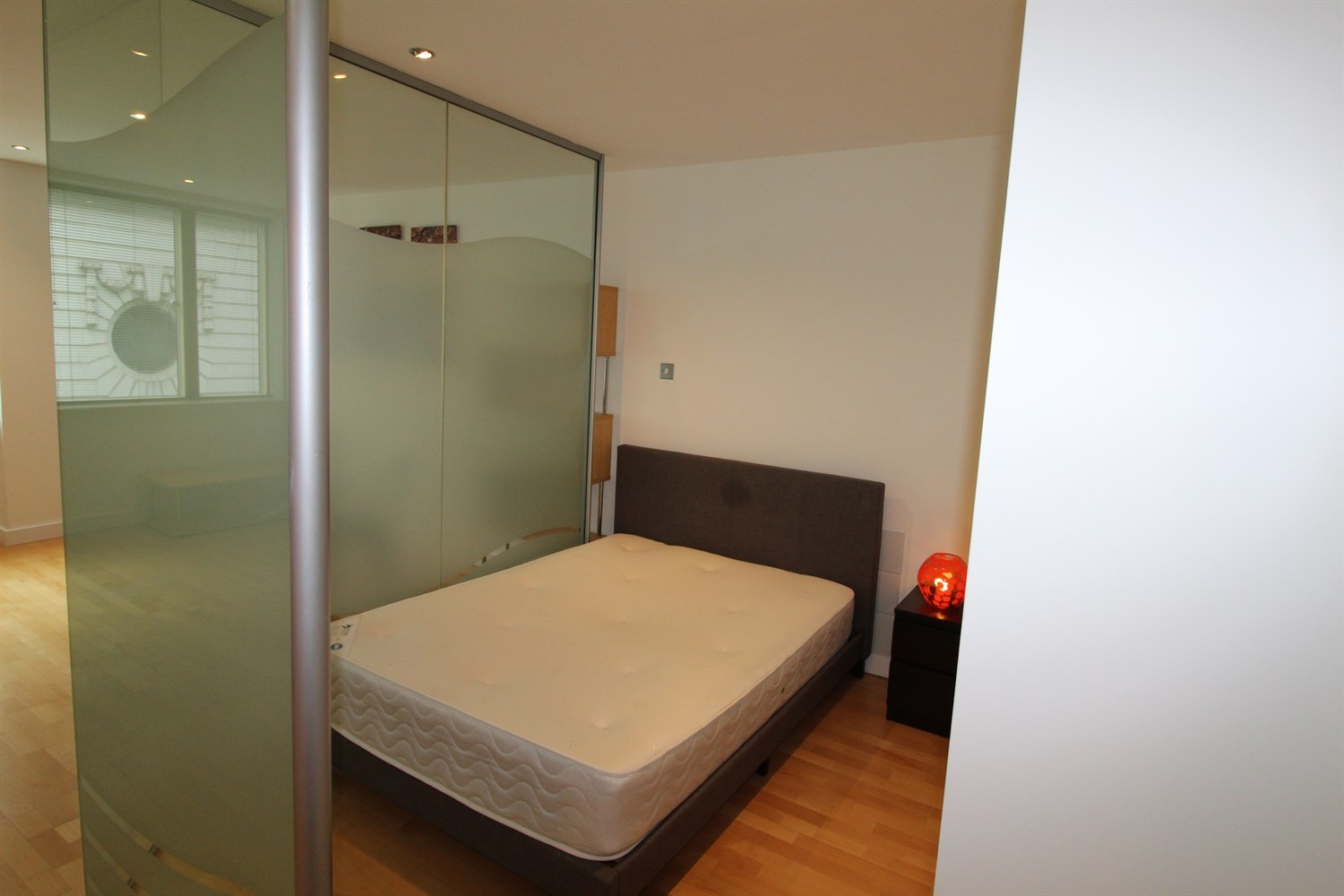Glass partitioned area to separate this studio apartment, with a double bed and bedside table