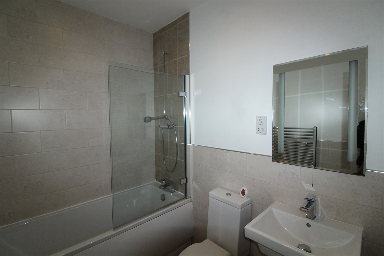 Three piece bathroom suite with shower over, shower screen, w/c and hand wash sink, tiled walls and towel radiator.