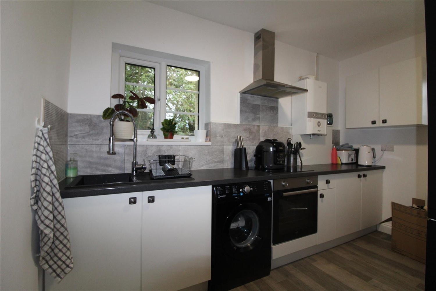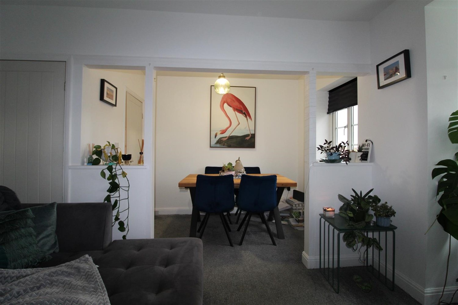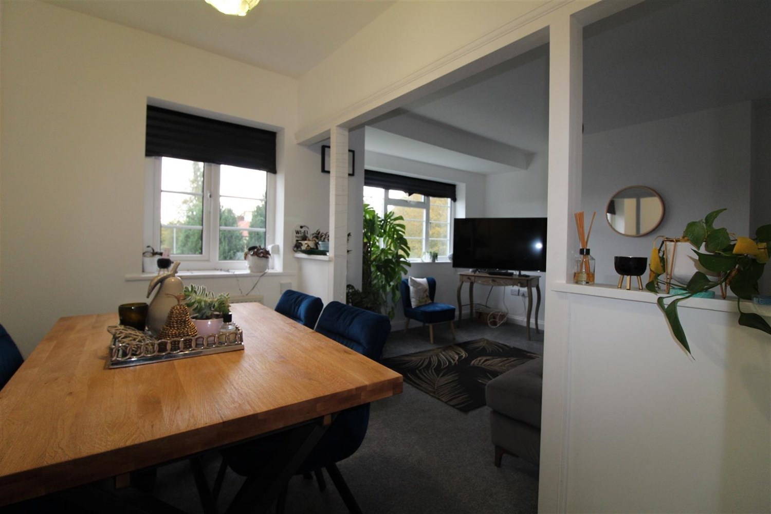 Open plan living area compromising a living room, dining room and kitchen. Gas central heating radiator in the dining room with windows to the front of the dining room and living area. and window to the back in the kitchen