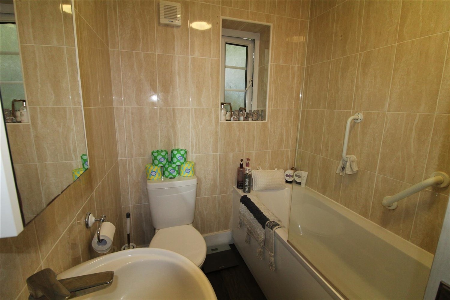 Three piece bathroom suite with shower over bath, w/c, hand wash basin, Tiled walls and floor.