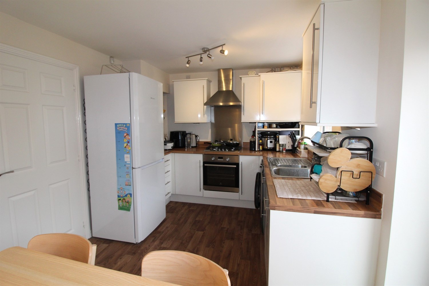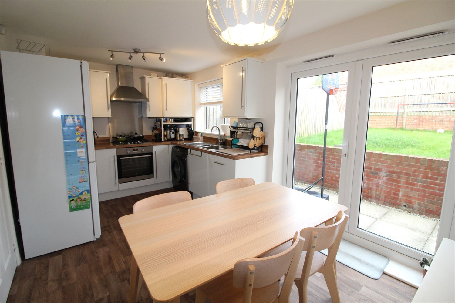 Open plan dining/kitchen with uPVC double glazed doors leading to the rear garden. The kitchen is fitted with a range of wall, base and drawer units with worktops over. Integrated oven with 4-ring gas hob and extractor hood over. Integrated dishwasher. Space for washing machine and fridge/freezer. Gas central heating radiator.