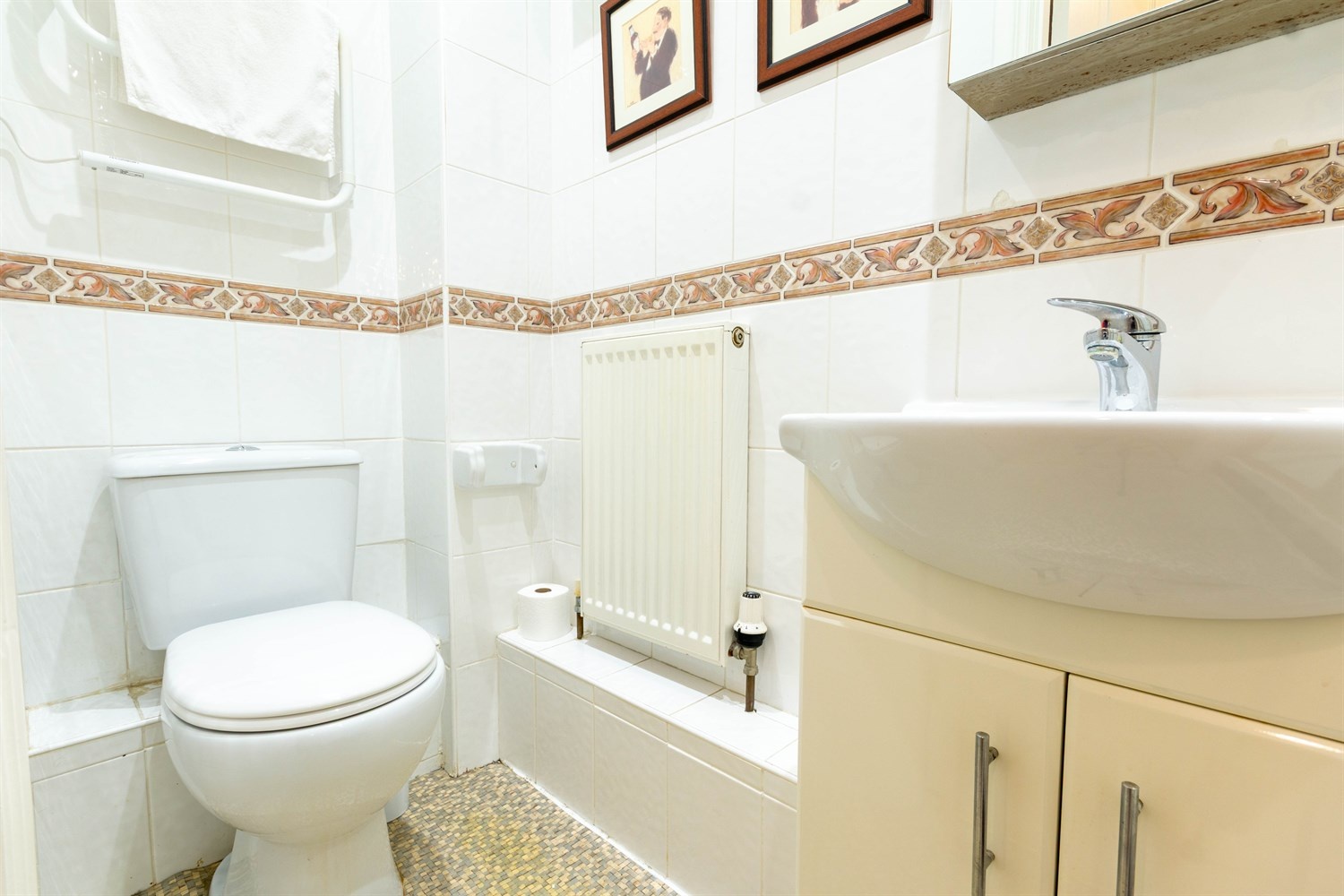 Fitted with a three piece suite comprising; shower cubicle, WC and vanity wash hand basin. Tiled walls. Gas central heating radiator.