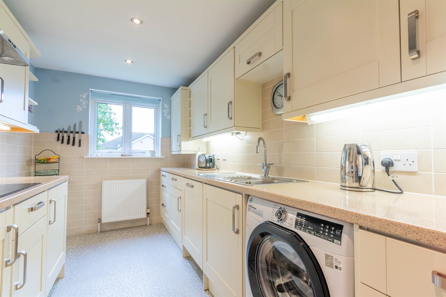 Fitted with a range of wall, base and drawer units with worktops over. Integrated double oven, 4-ring hob with extractor hood over. Integrated dishwasher, fridge and freezer. 1.5 bowl stainless steel sink with mixer tap and drainer. Space for washing machine. Gas central heating radiator. uPVC double glazed window. Inset ceiling spotlights.