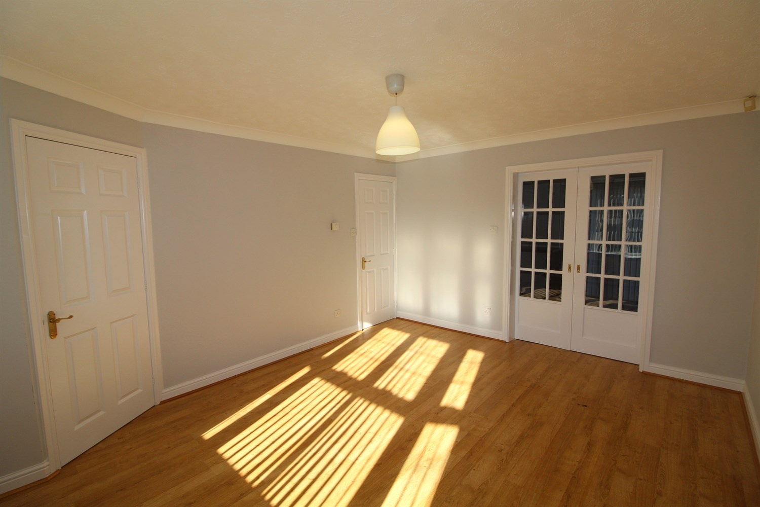 Large living room with window to front, doors opening to kitchen, large understairs storage.