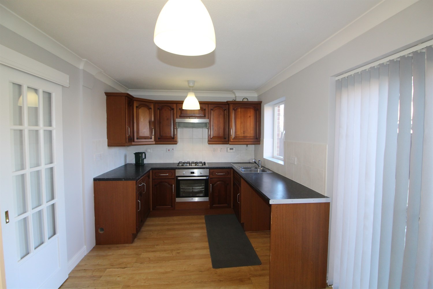 Fitted with a range of wall and base units, with window to rear, stainless steel sink with mixer tap, gas cooker and electric oven, extractor over head. space for under counter washer.