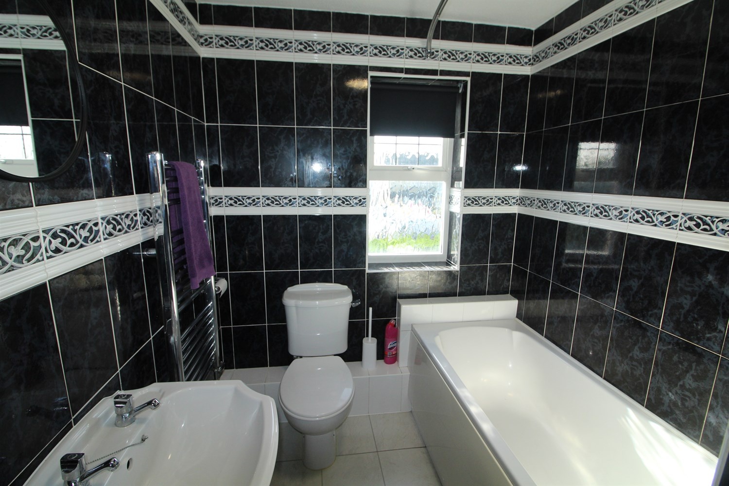 Three piece white bathroom suite, with shower over bath, w/c and hand wash basin, tiled walls.