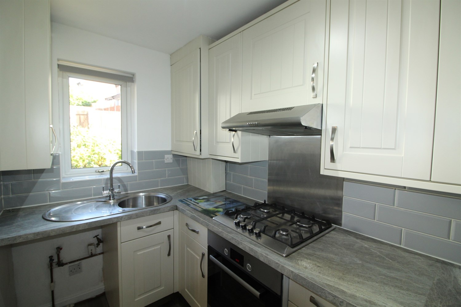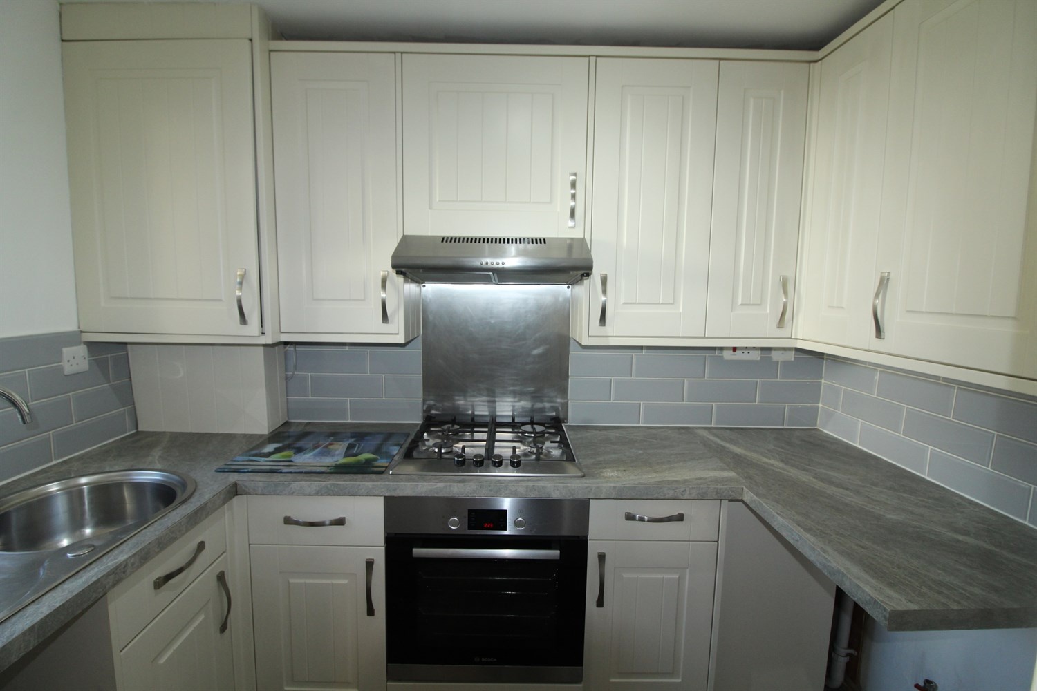 Fitted with a range of wall and base units with worktops over, stainless sink, part tiled walls window to front.